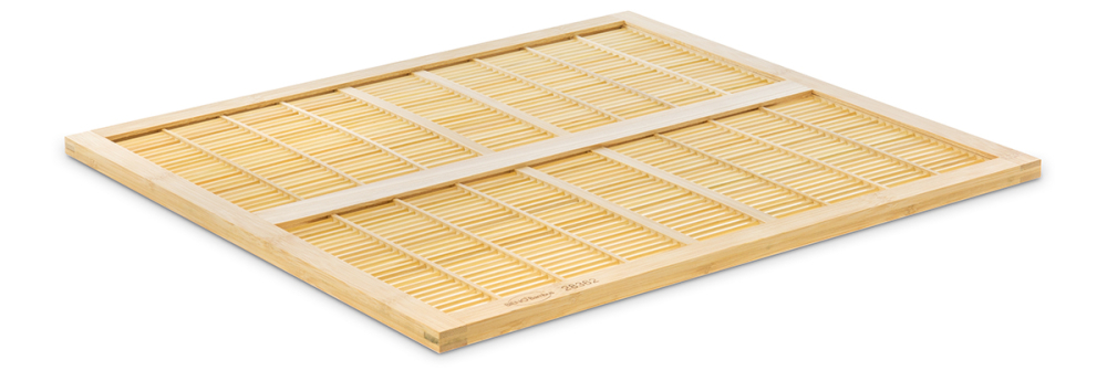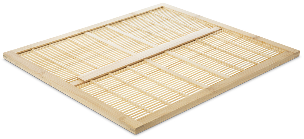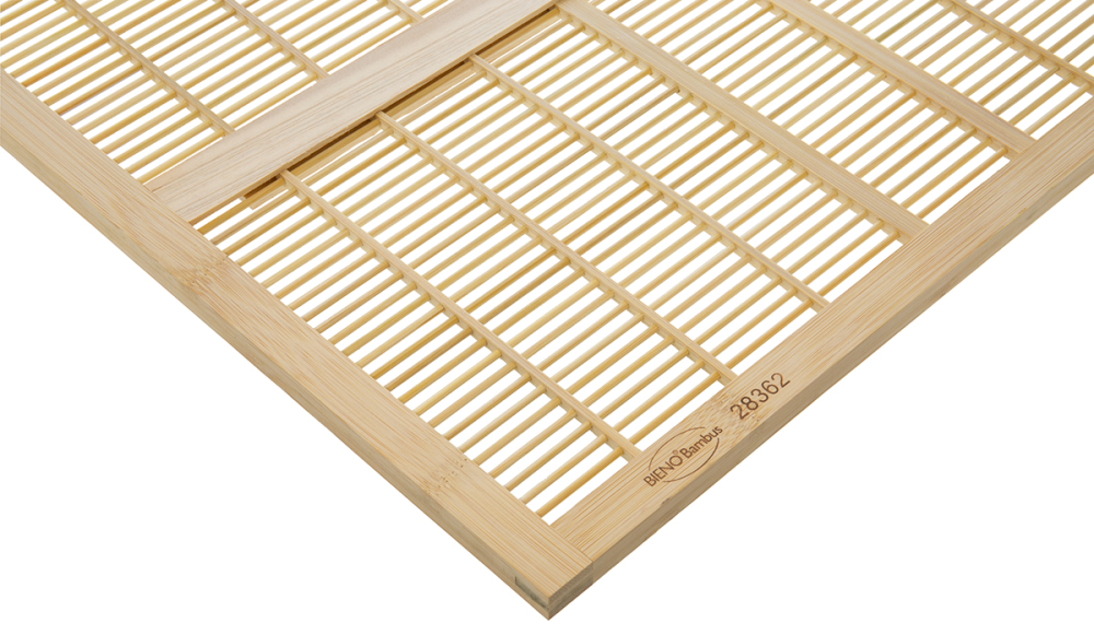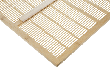 hergestellt aus 3 mm starken Bambus-Rundstäben mit einem Abstand von 4,2 mm, mittig eingefasst in einem 13 mm hohem Holzrahmen, Außenmaß ca. 465 x 420 mm