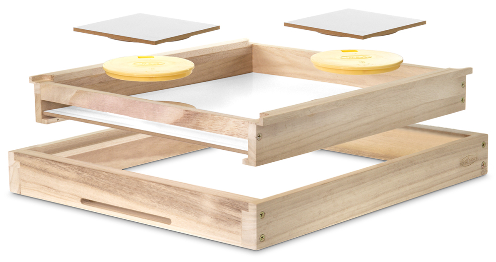 bestehend aus Doppel-Holzrahmen mit Flugloch, herausnehmbarer Zwischenbodenplatte mit zwei Spundlöchern, Abdeckungen und runden Bienenfluchten. Somit 2-fach nutzbar als Fluchtschied oder als geschlossener Zwischenboden