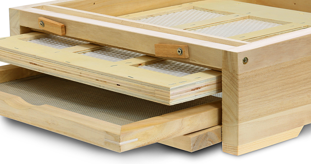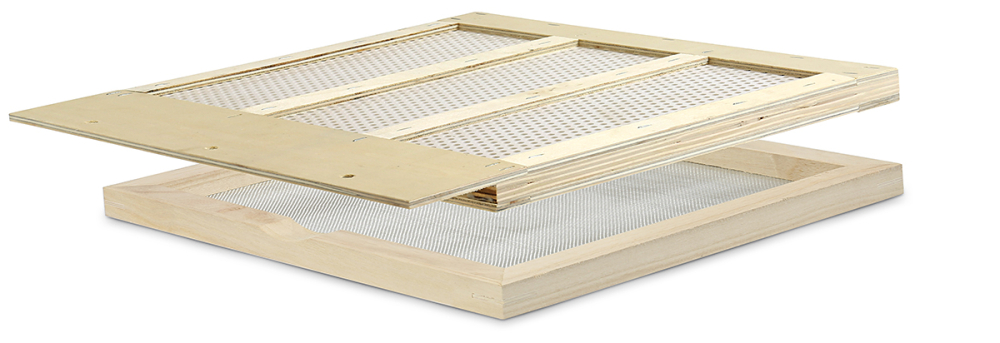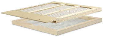 2- teilig bestehend aus großflächigem Pollenkamm aus Kunststoffgewebe mit Ø 5 mm Löcher und Pollen-Auffangrahmen. Beide Rahmen werden durch die hintere Arbeitsklappe eingeschoben, ohne den Kasten zu öffnen