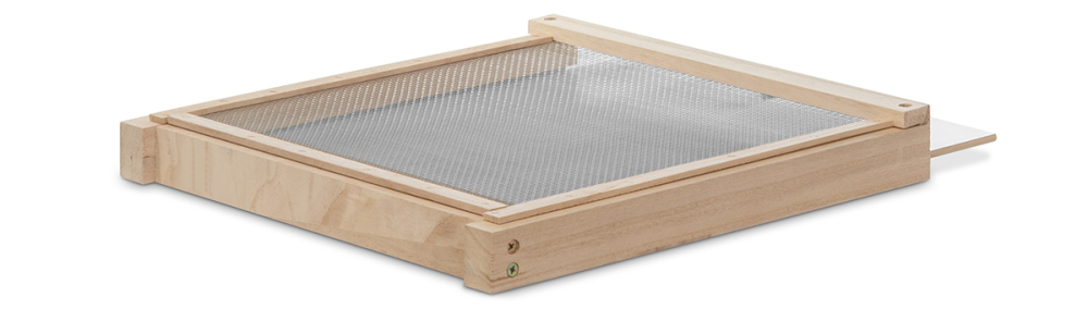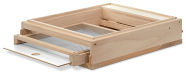 zum Einschub von hinten in den Hochboden zur Erleichterung der Varroakontrolle. Nach der Behandlung empfehlen wir die Schieblade wieder zu entfernen, damit die Vorteile des Hochbodens wie Trommelraum und Luftzirkulation zum Tragen kommen