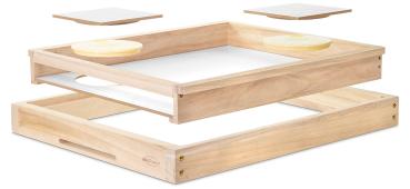 bestehend aus Doppel-Holzrahmen mit Flugloch, herausnehmbarer Zwischenbodenplatte mit zwei Spundlöchern, Abdeckungen und runden Bienenfluchten. Somit 2-fach nutzbar als Fluchtschied oder als geschlossener Zwischenboden