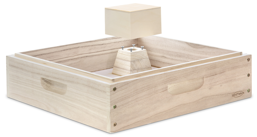 mit Eck-Aufstieg und Domabdeckung. Verleimt und geschraubt, Inhalt ca. 8 Liter. Eck-Aufstieg mit 4 Schrauben zur Feinjustierung Vor Gebrauch den Innenraum inkl. Eck-Aufstieg mit Bottichlack Art. 2127 oder ApiDana® Futterzargen Lack Art. 21275 streichen