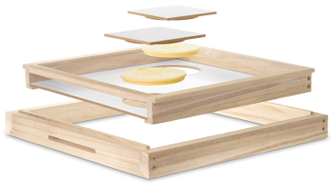 bestehend aus Doppel-Holzrahmen mit Flugloch, herausnehmbarer Zwischenbodenplatte mit zwei Spundlöchern, Abdeckungen und runden Bienenfluchten. Somit 2-fach nutzbar als Fluchtschied oder als geschlossener Zwischenboden