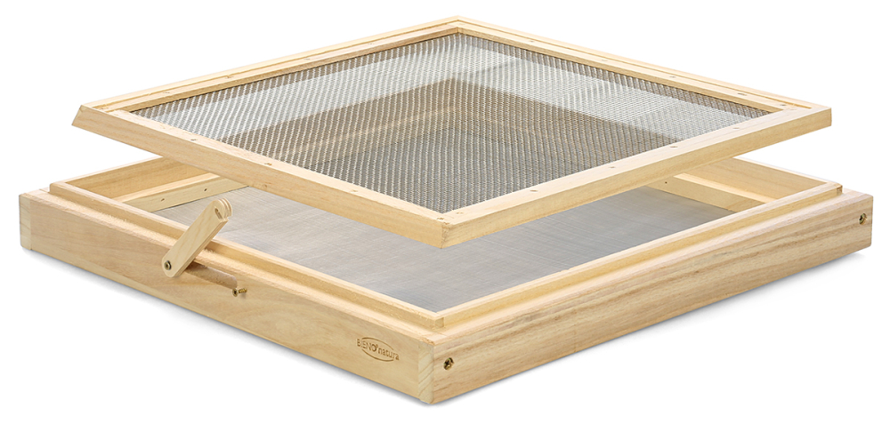 zweiteilig, bestehend aus einem Unter-Holzrahmen mit Flugloch und eingefasstem, feinem Edelstahlgitter und einem Ober-Holzrahmen mit eingefasstem Varroagitter Außenmaß 444 x 444 mm