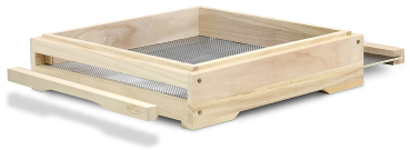 Kompakter, massiver Holzboden mit Edelstahl Lüftungsgitter und seitl. Griffmulden nach Imkermeister Werner Schundau