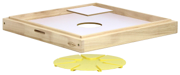 mit Flugloch und verschließbarem Spundloch. Durch Einsatz der mitgelieferten Bienenflucht ist der Zwischenboden auch als Honigentnahmeschied einsetzbar. Höhe 4,5 cm, Gewicht ca. 1 kg