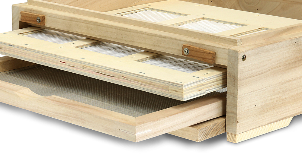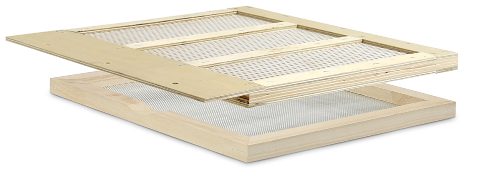 2- teilig bestehend aus großflächigem Pollenkamm aus Kunststoffgewebe mit Ø 5 mm Löcher und Pollen-Auffangrahmen. Beide Rahmen werden durch die hintere Arbeitsklappe eingeschoben, ohne den Kasten zu öffnen