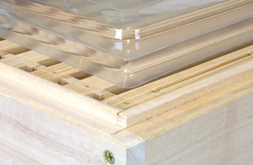 mit Falz zur Auflage auf der Zarge, glasklar aus PET Kunststoff, 0,3 mm stark Größe ca. 44,8 x 44,8 cm