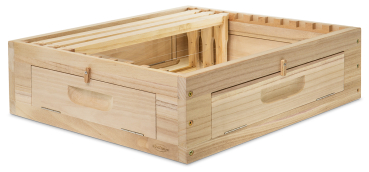 für 10 Rähmchen Dadant US Honig mit 141 mm Höhe, mit festen verbautem Abstandsrechen. Der Clou sind die über Scharniere zu öffnenden vier Seitenwände hinter denen sich jeweils eine Plexi-Scheibe für den ungehinderten Blick in das Bienenvolk befindet. Design registriert beim DPMA und gesetzlich geschützt