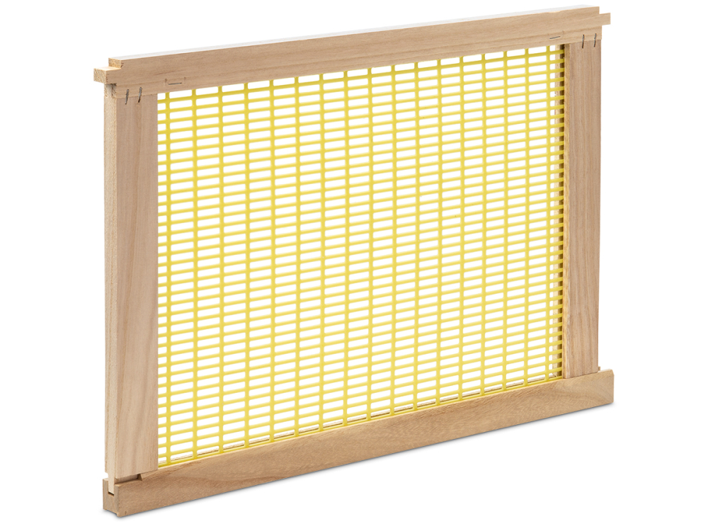 Kunststoff, im Holzrahmen eingefasst, passend für 12er Dadant US Holzbeute Oberträger ca. 482 mm, Trennplatte ca. 464 mm, Gesamthöhe ca. 300 mm, ca. 15 mm stark