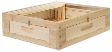 für 12 Rähmchen Dadant US Honig mit 141 mm Höhe, mit fest verbauten Edelstahl-Auflageschienen. Der Clou sind die über Scharniere zu öffnenden vier Seitenwände hinter denen sich jeweils eine Plexi-Scheibe für den ungehinderten Blick in das Bienenvolk befindet. Design registriert beim DPMA und gesetzlich geschützt