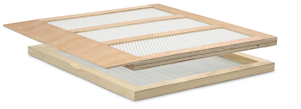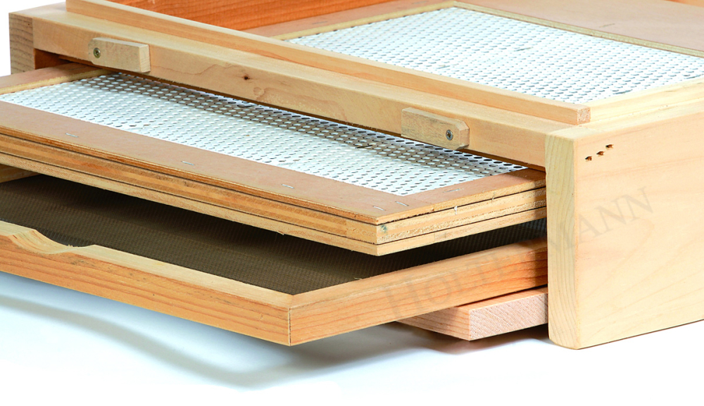 2-teilig bestehend aus großflächigem Pollenkamm aus Kunststoffgewebe mit Ø 5 mm Löcher und Pollen-Auffangrahmen. Beide Rahmen werden durch die hintere Arbeitsklappe eingeschoben, ohne den Kasten zu öffnen