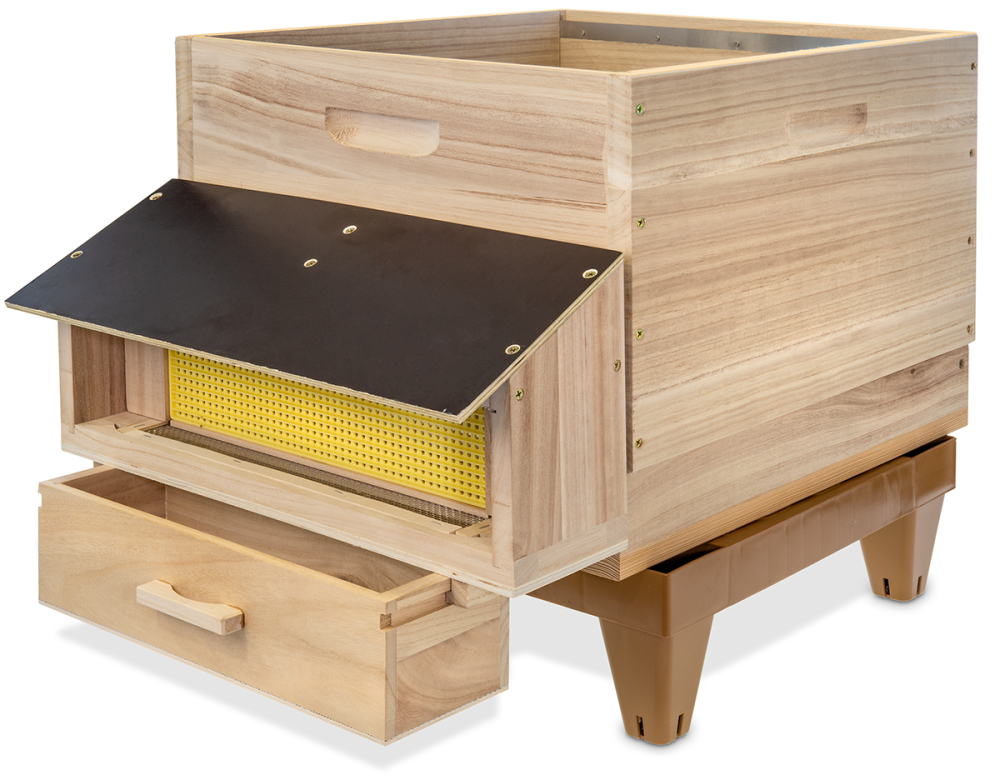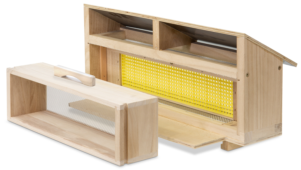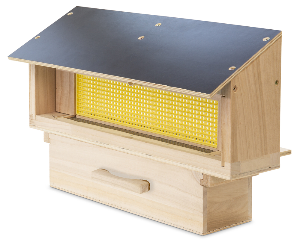 Fluglochvorsatz mit einem nach vorn herausziehbarem Rundloch-Kunststoff-Pollenkamm und Schale aus Holz. Bitte beachten: Beim Einsatz dieser Pollenfalle muss der Boden erhöht aufgestellt werden, z.B. auf einen Beutenbock. Passend für den Dadant US Varroaboden, Art. 2512 Größe ca. 51 x 33 cm, Höhe 26 cm