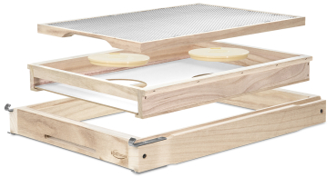 bestehend aus Doppel-Holzrahmen mit Flugloch, herausnehmbarer Zwischenbodenplatte mit zwei Spundlöchern, Abdeckungen und runden Bienenfluchten, Drahtrahmen mit Lüftungsgitter. Somit 6-fach nutzbar: Fluchtschied, Zwischenboden mit Rüsselkontakt, geschlossener Zwischenboden, Oberlüfter, Oberflugloch und Futtergitter