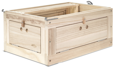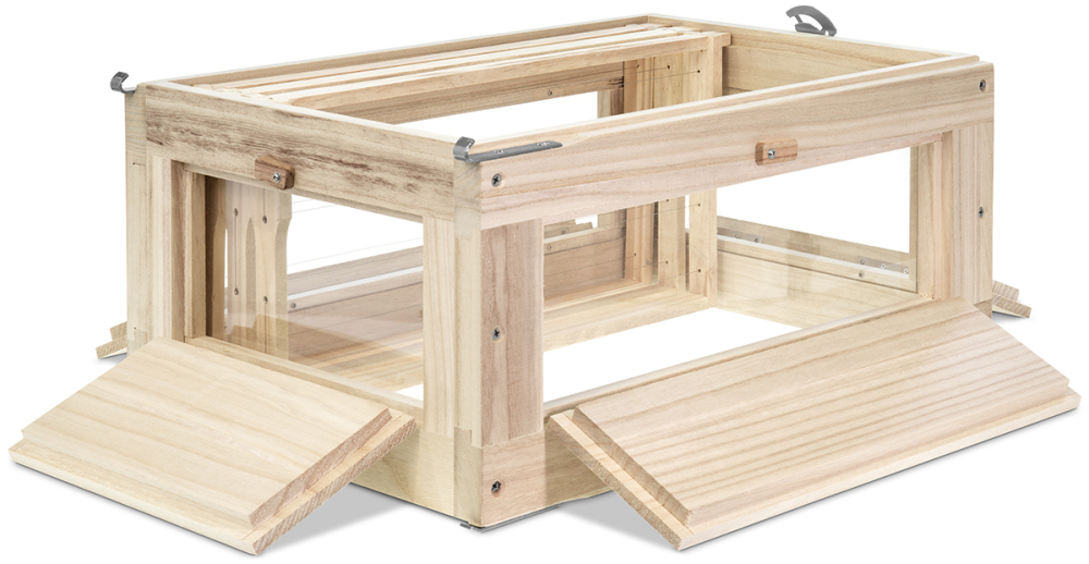 für 9 Rähmchen Zander Kurzohr von 452 x 220 mm. Der Clou sind die über Scharniere zu öffnenden vier Seitenwände hinter denen sich jeweils eine Plexi-Scheibe für den ungehinderten Blick in das Bienenvolk befindet.