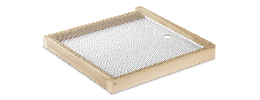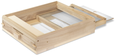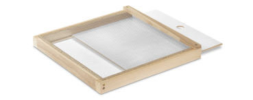 zum Einschub von hinten in den Hochboden zur Erleichterung der Varroakontrolle. Nach der Behandlung empfehlen wir die Schieblade wieder zu entfernen, damit die Vorteile des Hochbodens wie Trommelraum und Luftzirkulation zum Tragen kommen