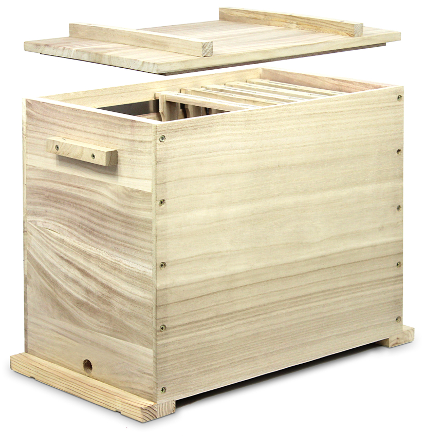 für 12 Rähmchen Kuntzsch Hoch, hergestellt aus 20 mm starkem Holz. Mit Edelstahl- Lüftungsgitter, zwei Griffen sowie vorder- und rückseitigem Flugloch. Außenmaß ca. 52 x 30 cm, Höhe 44 cm Gewicht ca. 4 kg