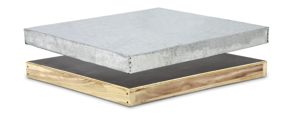 bestehend aus einem Holzdeckel mit zusätzlichem, abnehmbarem Blechdeckel. Außenmaß ca. 75 x 70 cm