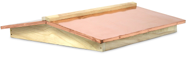 massiv und aus astfreiem Holz und mit umlaufendem Dachüberstand mit wetterfestem Kupferbeschlag und Firstleiste. Außenmaß ca. 79 x 75 cm, Höhe 16 cm, Gewicht ca. 10 kg