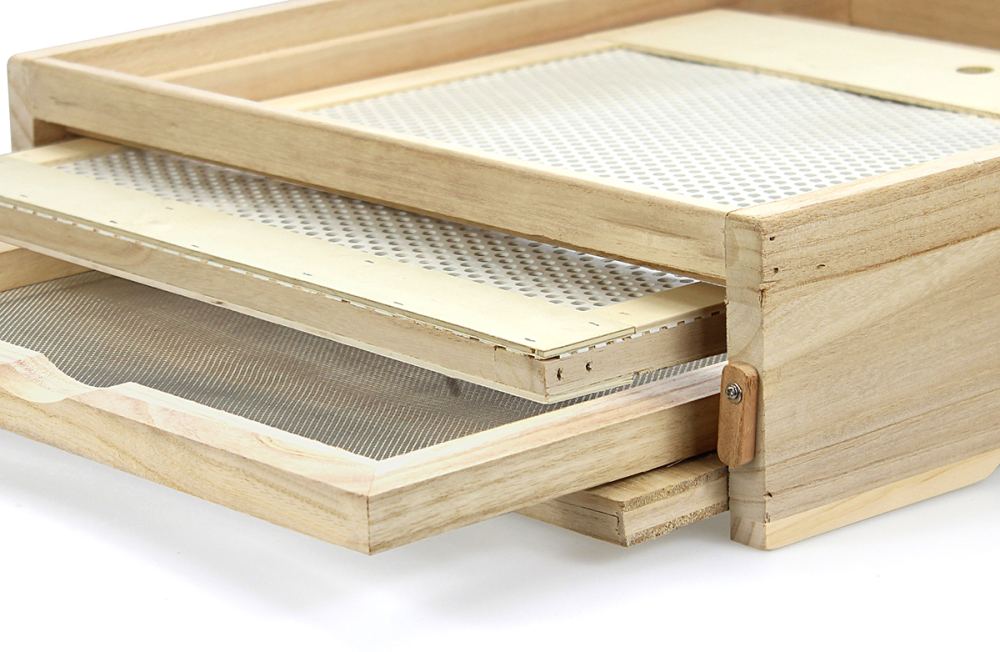 2- teilig bestehend aus großflächigem Pollenkamm aus Kunststoffgewebe mit Ø 5 mm Löcher und Pollen-Auffangrahmen. Beide Rahmen werden durch die hintere Arbeitsklappe eingeschoben, ohne den Kasten zu öffnen