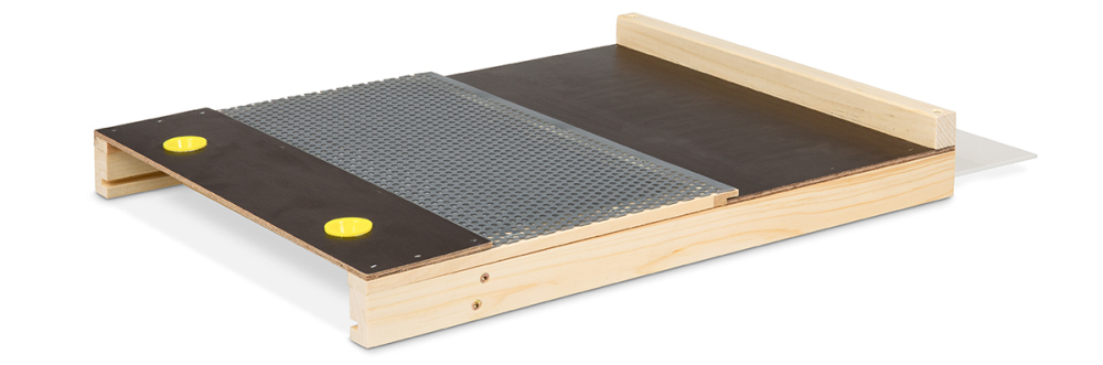 zum Einschub von hinten in den Hochboden, mit Edelstahl-Gitter, Kunststoff-Pollenkamm, Auffang-Schieber und 2 Trichter Bienenfluchten