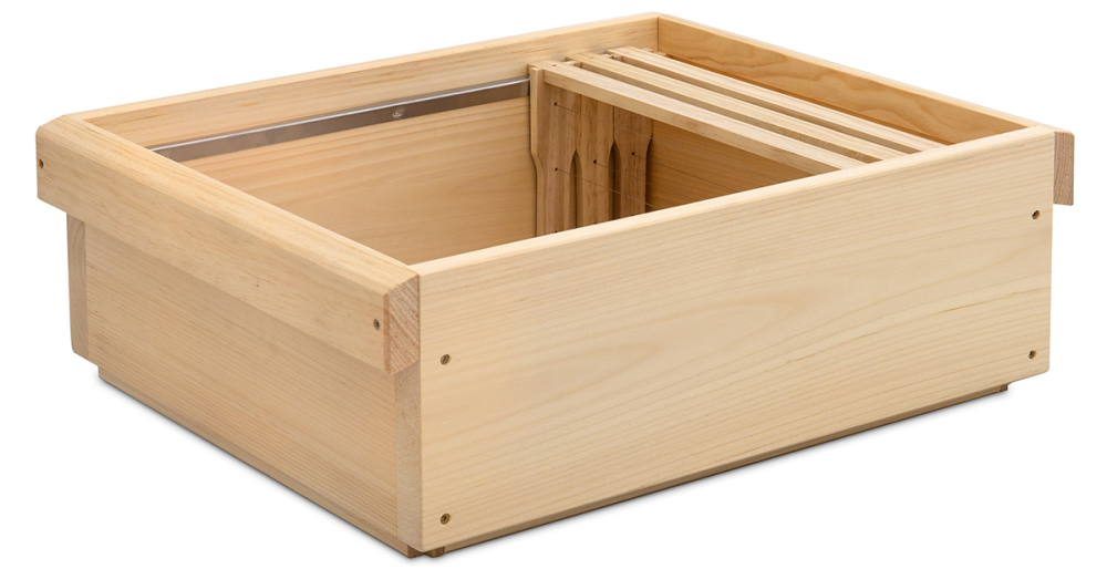 passend für 12 Rähmchen Normalmaß mit 159 mm Höhe, bei dieser Zarge sind zwei lange Edelstahlschienen für Normalmaß bereits fest montiert Gewicht ca. 3 kg, Höhe 18,2 cm