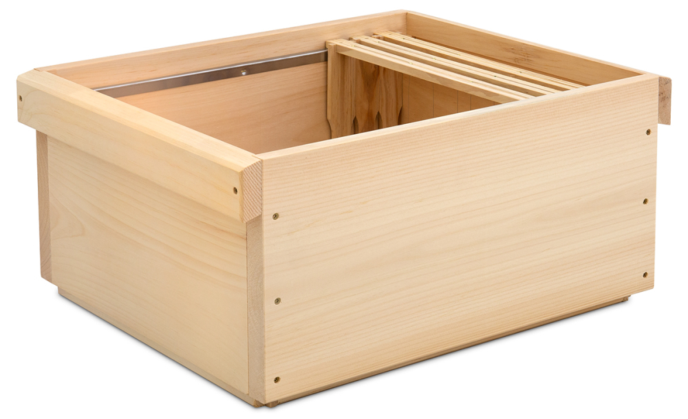 passend für 12 Rähmchen Normalmaß mit 223 mm Höhe, bei dieser Zarge sind zwei lange Edelstahlschienen für Normalmaß bereits fest montiert Gewicht ca. 4,3 kg, Höhe 24,8 cm