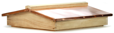 massiv und aus astfreiem Holz und mit umlaufendem Dachüberstand mit wetterfestem Kupferbeschlag und Firstleiste. Außenmaß 56 x 49 cm, Höhe 15,5 cm, Gewicht ca. 5,5 kg