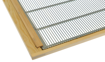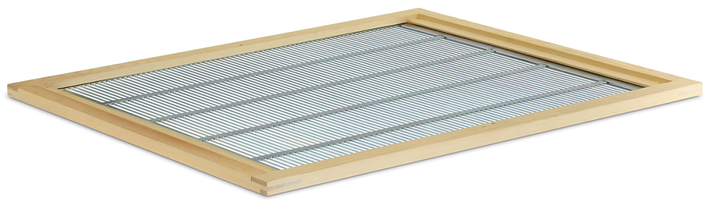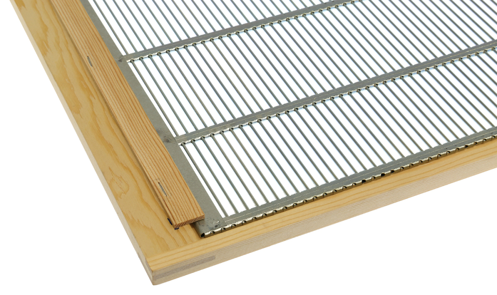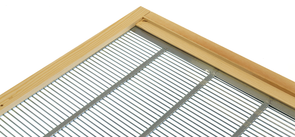 verzinktes Metall-Absperrgitter 394 x 456 mm, im Holzrahmen genietet und mit zwei Leisten vor Verrutschen gesichert Außenmaß ca. 515 x 426 mm, Höhe 12 mm