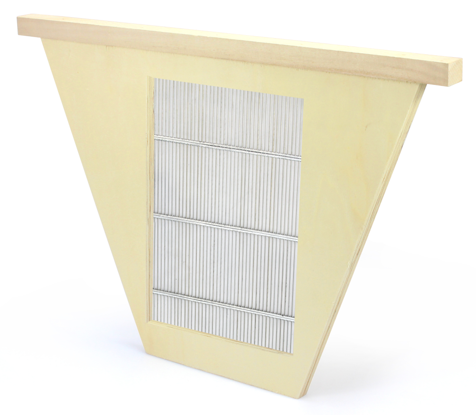 verzinkt, im Holzrahmen eingefasst. Oberträger 517 x 18 x 23 mm. Trennplatte Höhe 327 mm, 14 mm stark