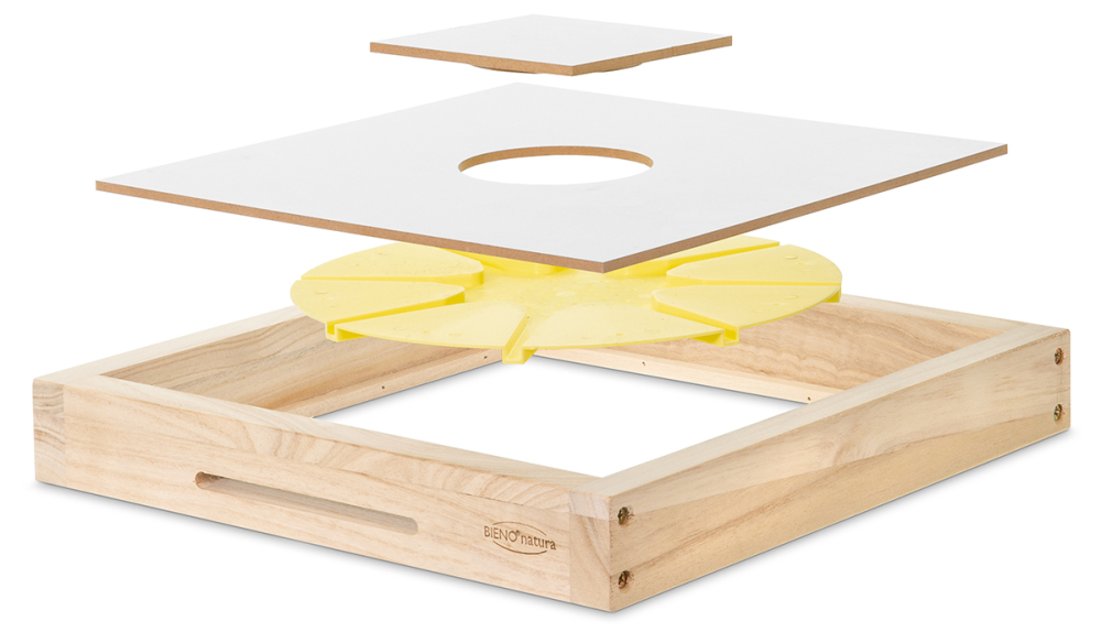 bestehend aus Holzrahmen mit Flugloch, herausnehmbarer Zwischenbodenplatte mit einem Spundloch, Abdeckung und runder 8er Bienenflucht. Somit 2-fach nutzbar als Fluchtschied oder als geschlossener Zwischenboden