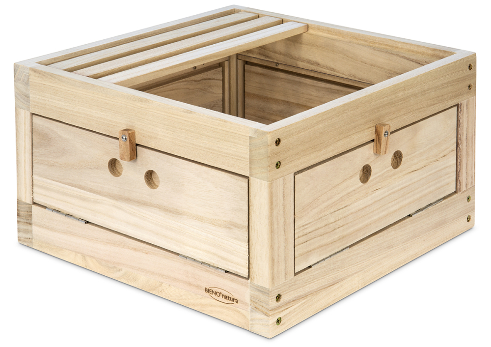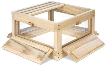 passend für 8 Wabenleisten. Der Clou sind die über Scharniere zu öffnenden vier Seitenwände hinter denen sich jeweils eine Plexi-Scheibe für den ungehinderten Blick in das Bienenvolk befindet