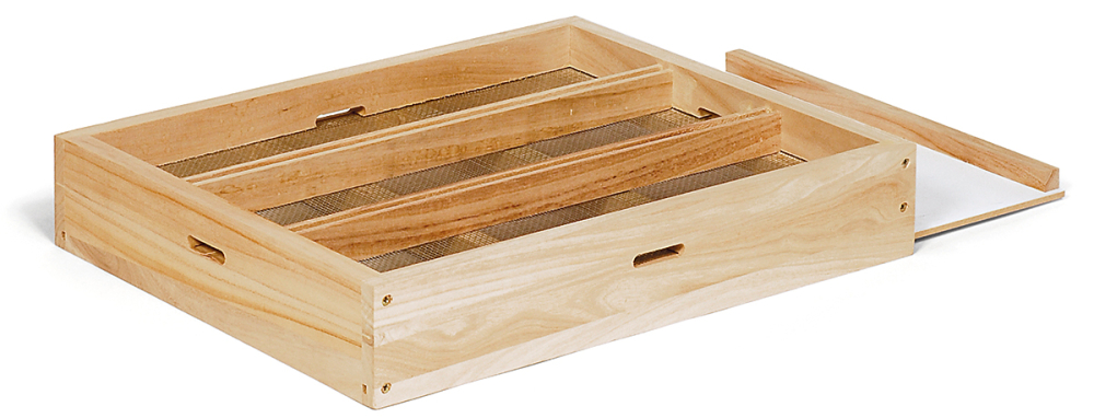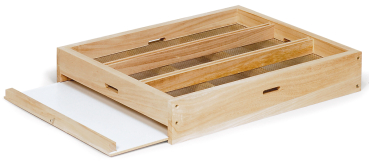 mit Edelstahl Varroagitter, Bodenschieber und drei Fluglöchern. Durch Einsatz der Trennschiede können bis zu drei Ableger zu je 3 Waben in einer Zarge gebildet werden. Passend für Zandermaß. Höhe ca. 9 cm, Gewicht ca. 2,5 kg