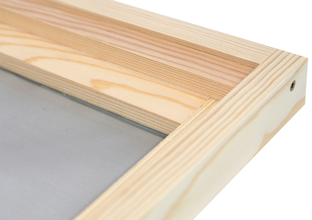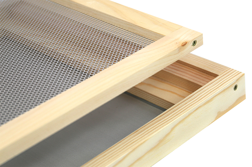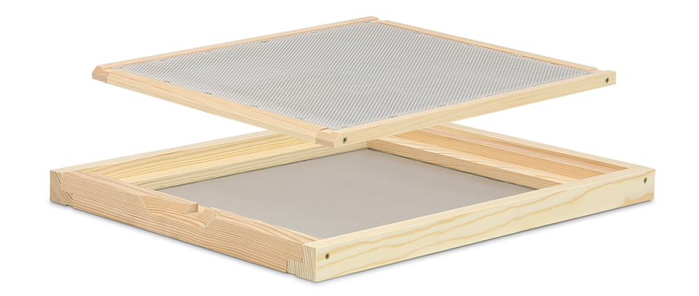 zweiteilig, bestehend aus einem Unter-Holzrahmen mit Flugloch und eingefasstem, feinem Edelstahlgitter und einem Ober-Holzrahmen mit eingefasstem Varroagitter Außenmaß ca. 520 x 420 mm