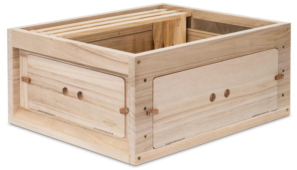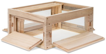 für 10 Rähmchen Zander von 477 x 220 mm, mit fest verbauten Edelstahl-Auflageschienen. Der Clou sind die über Scharniere zu öffnenden vier Seitenwände hinter denen sich jeweils eine Plexi-Scheibe für den ungehinderten Blick in das Bienenvolk befindet.