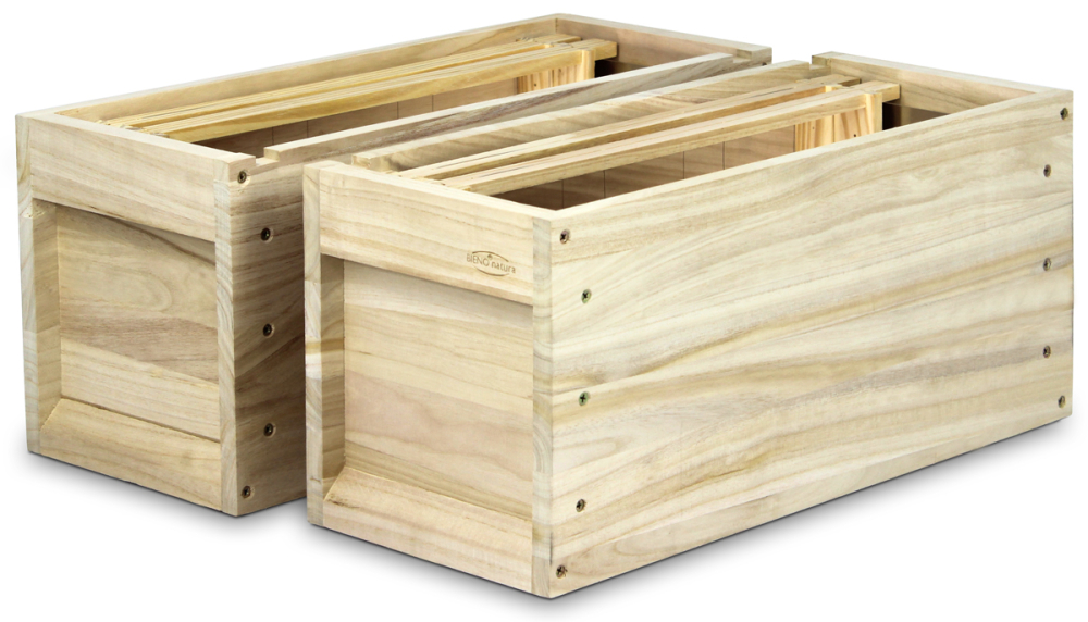 Bitte bestellen SIe zusätzlich zwei Kork-Plättchen (Art. 24472) zum Verschließen der beiden Auskerbungen an der Längsseite, wenn Sie zwei Vertikel Halbzargen übereinander als Ablegerkasten verwenden möchten.