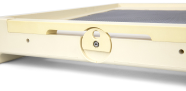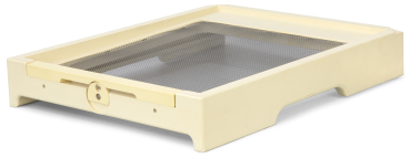 massiver Flachboden aus hellgelbem Polyurethan. Ausgestattet mit Edelstahl-Lüftungsgitter, Fluglochkeil, Fluglochrosette und Laufschacht für einen Bodenschieber Außenmaß ca. 52 x 42 cm, Höhe ca. 8 cm