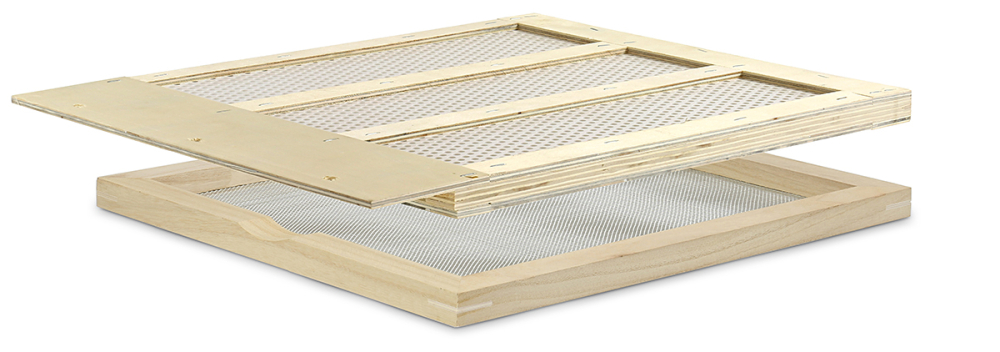 2- teilig bestehend aus großflächigem Pollenkamm aus Kunststoffgewebe mit Ø 5 mm Löcher und Pollen-Auffangrahmen. Beide Rahmen werden durch die hintere Arbeitsklappe eingeschoben, ohne den Kasten zu öffnen
