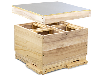 Passend für bis zu 24 Rähmchen Dadant US Vertikal, die zusammengesteckt das Maß von 482 x 285 mm Dadant modifiziert/Dadant US ergeben. Großzügige Beute für die Aufzucht junger Königinnen oder zur Ablegerbildung. In den 4 Abteilen wachsen überwinterungsfähige junge Völker heran, die in der Mitte, wärmetechnisch, eine "gemeinsame Wintertraube" bilden.