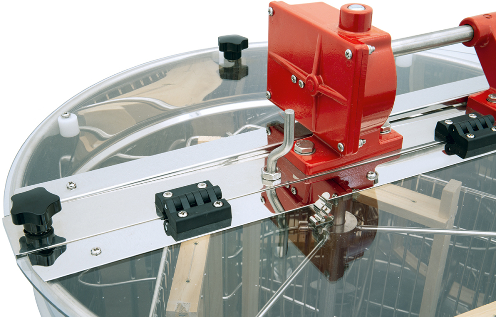 Handantrieb mit Getriebe aus Stahlzahnrädern, Rückdruckbremse und polierter Edelstahltraverse