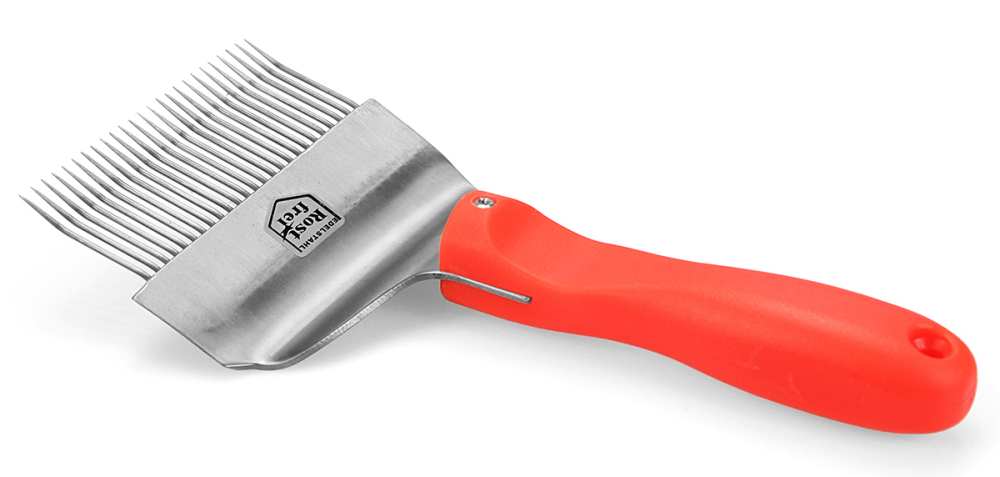 extra breit, mit gebogenen Edelstahl-Nadeln, neonfarbigem Kunststoffgriff und seitlichem Messer