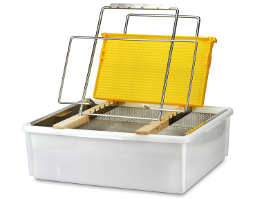 mit Kunststoffwanne, Edelstahleinsatz mit Tropfblech, kompaktem Wabenhalter für eine Person sowie Holz-Schienen-Wabenbock mit Rundstab-Stütze