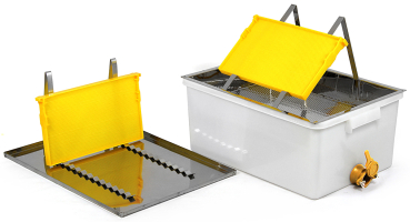 bestehend aus einer hohen Kunststoff- wanne von 25 cm mit eingeschraubtem Imgut® Quetschhahn, Edelstahleinsatz mit Tropfblech, Wabenhalter für eine Person sowie Edelstahldeckel mit Wabenablage. Maß: ca. 60 x 45 cm Höhe ca. 26 cm