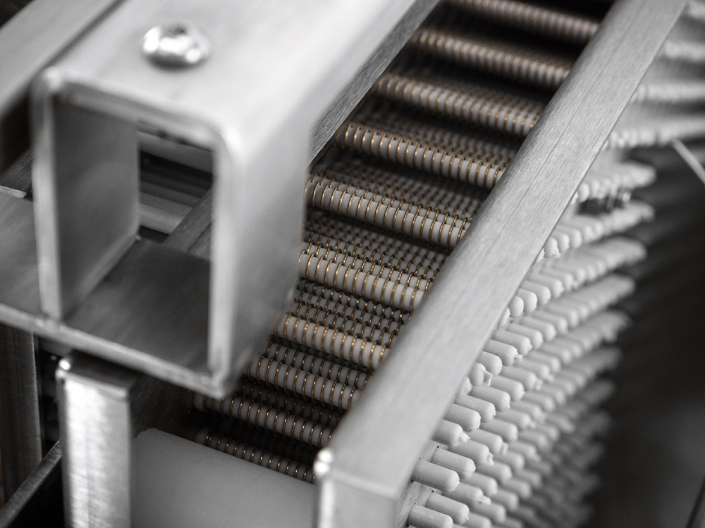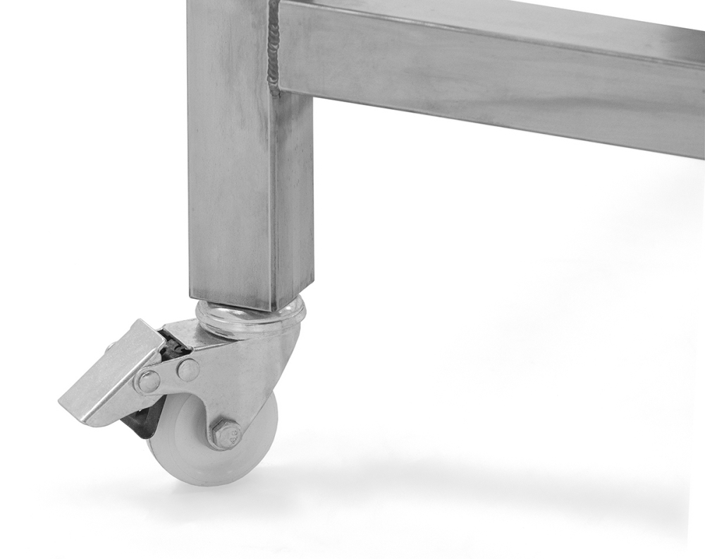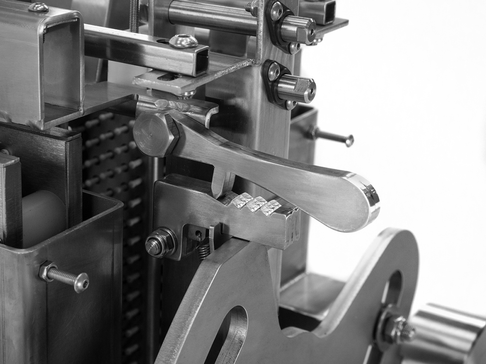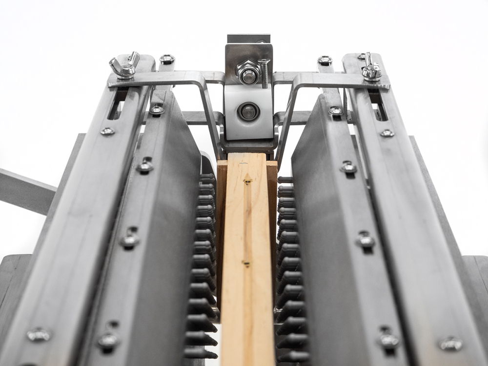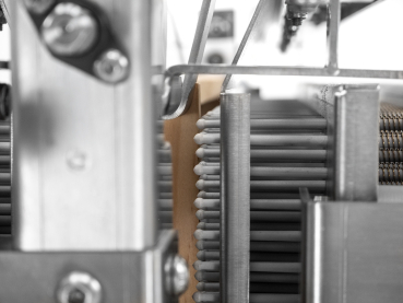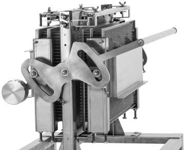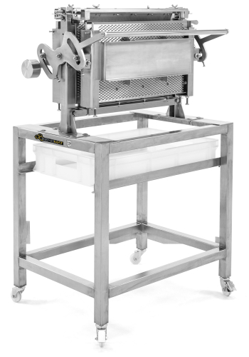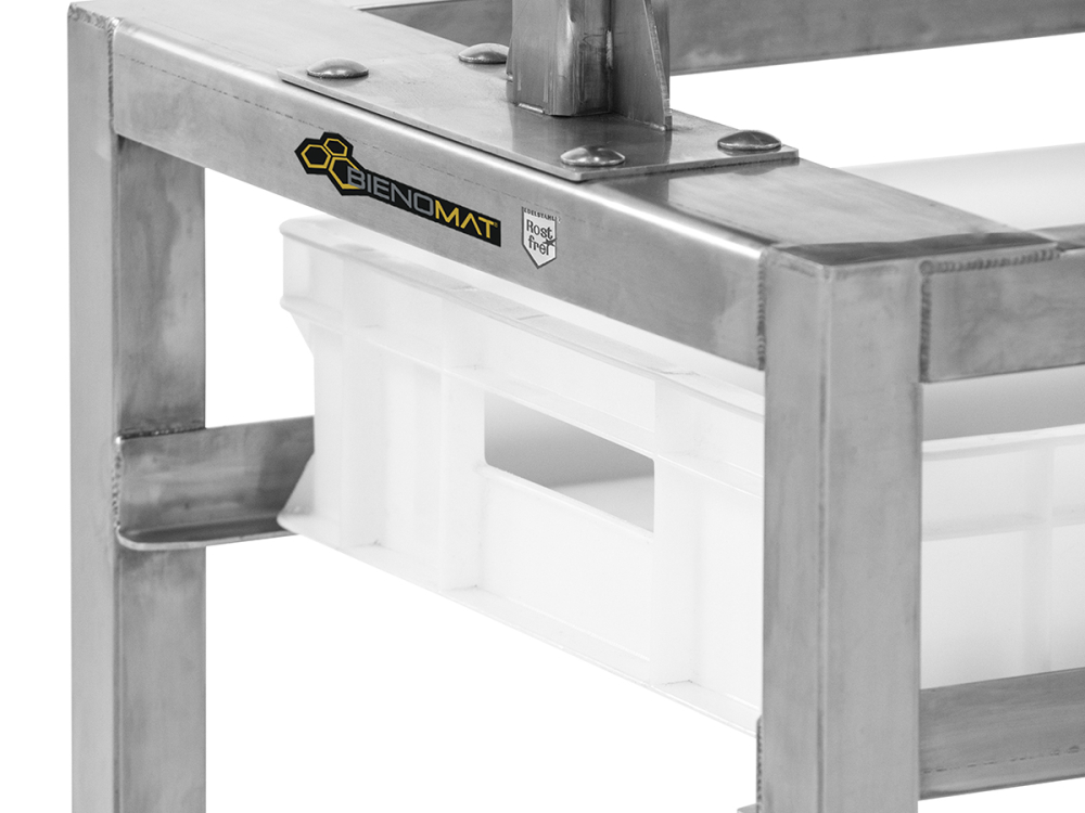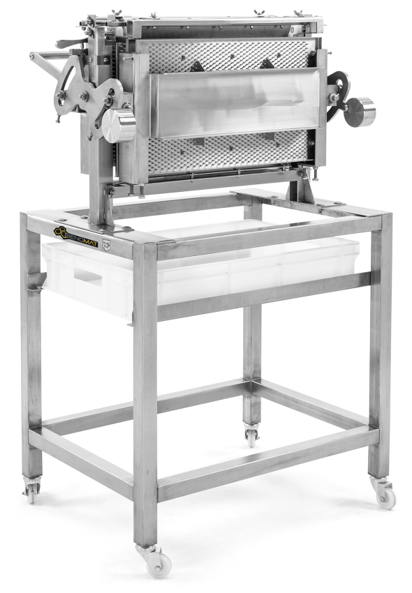 komplett aus Edelstahl mit Kunststoff-Federstiften, Lenkrollen mit Stop und entnehmbarer Kunststoff-Auffangwanne. Zum Lösen auch von Honigen mit hoher Viskosität, z.B. Heidehonig. Die Anordnung zahlreicher, feiner Federstifte auf einer Matrize sorgt für gleichmäßigen Druck auf die ausgebaute Waben. Für Rähmchen bis zu einer Länge von 482 mm und einer Höhe bis 290 mm. Die Federstifte werden vorsichtig in die mit Honig gefüllten Waben gedrückt ohne die Mittelwand zu beschädigen. Dieser Vorgang wird bis zu drei mal wiederholt, wobei die Position der Federstifte sich bei jedem Betätigen um wenige Millimeter horizontal verschiebt. Infolgedessen wird der gesamte Bereich der Waben auf dem Rähmchen flächendeckend und fein bearbeitet. Matrize: ca. 42,5 x 27,5 cm Auffangwanne: ca. 60 x 40,5 x 11 cm Außenmaß: ca. 67,5 x 49 cm, Höhe 115 cm Gewicht: 52 kg