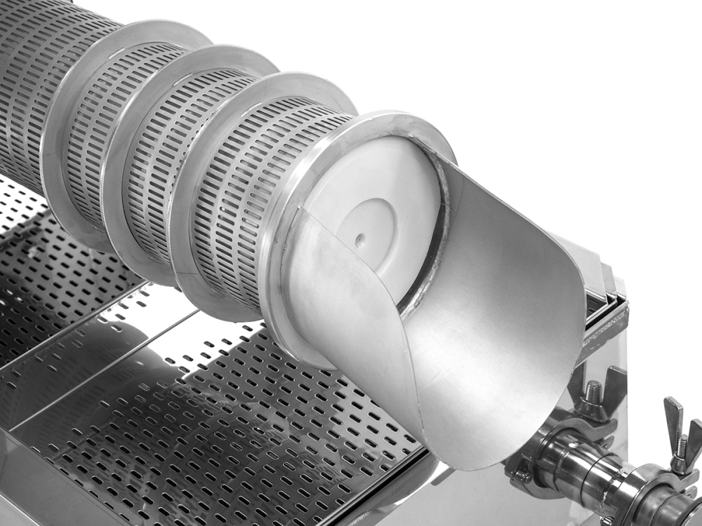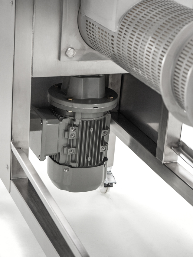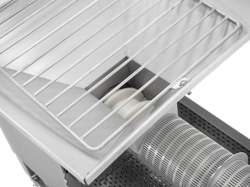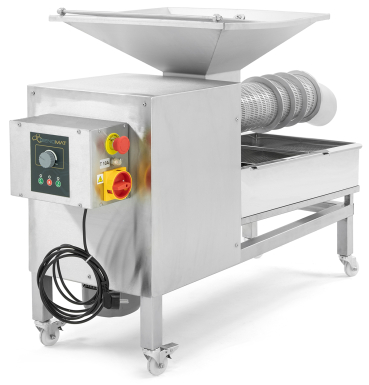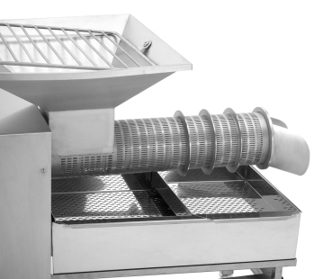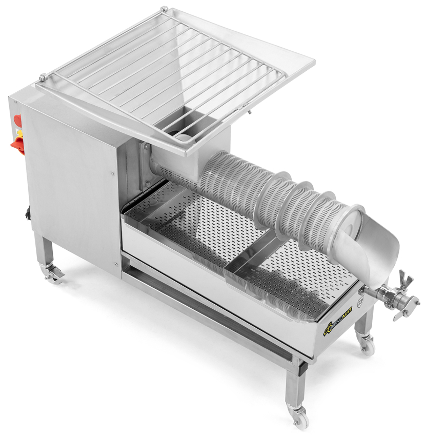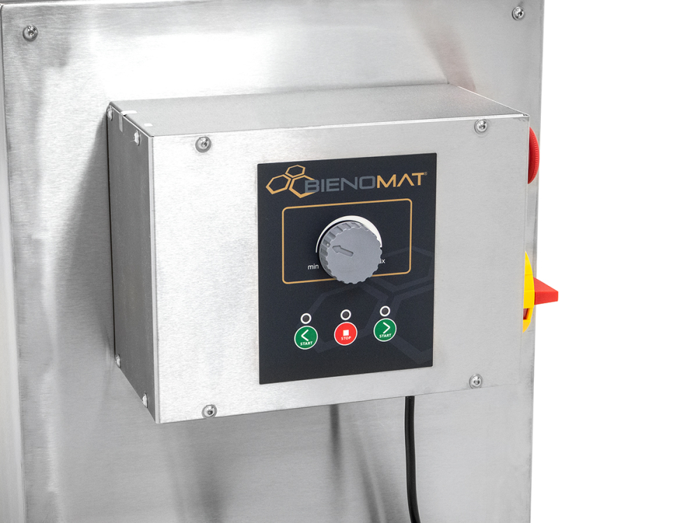 Mobile Schneckenpresse aus Edelstahl mit 4 feststellbaren Rädern, 52 x 47 cm großem Trichter, Honig-Auffangwanne mit herausnehmbarem 2fach-Sieb, Kunststoff-Spindel, sowie einem Edelstahl-Quetschahn mit 22 cm hohem Auslauf. Elektronisches Trennen und Pressen von Entdecklungswachs, Honigwaben, Heidehonig oder Melezitose mit separaten Auffangbehältern. Kapazität für bis zu 100 kg/Stunde, Geschwindigkeit und Laufrichtung der Schnecke stufenlos einstellbar, Motor 230 V/550 W Maße ca. 116 x 52 x 80 cm, Gewicht ca. 90 kg