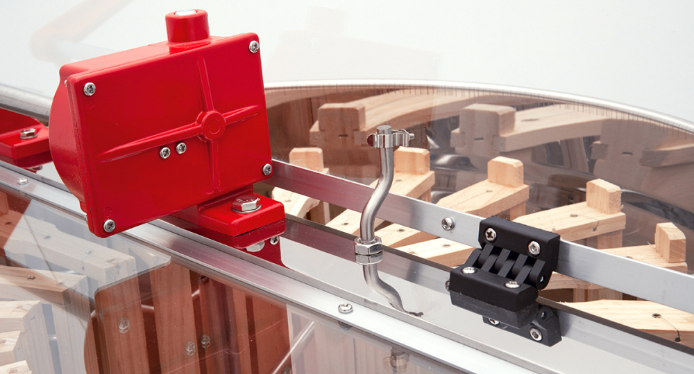 Handantrieb mit Getriebe aus Stahlzahnrädern, aufgebaut auf massiver Edelstahltraverse