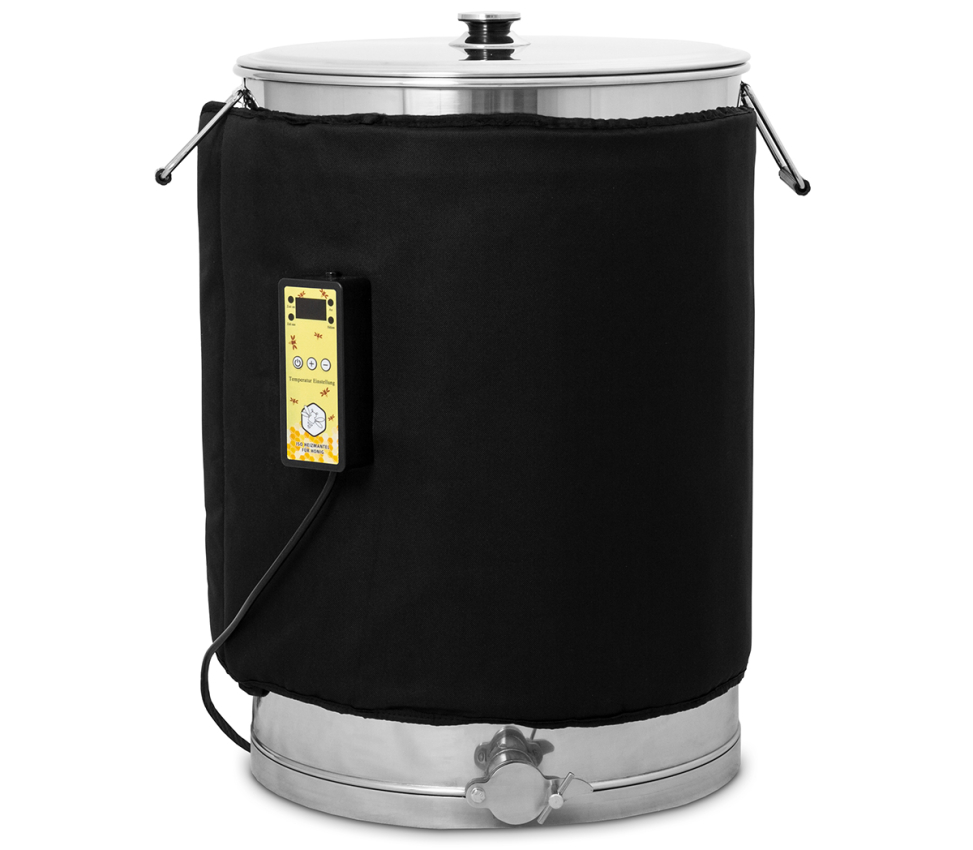 Isolierter Heizmantel zum Honig Erwärmen als Unterstützung zum Abfüllen oder Rühren. Dazu wird der Heizmantel um den Abfüllkübel oder das Rührwerk gelegt und mittles großzügigem Klettverschluss verschlossen. Die Temperatureinstellung erfolgt gradgenau, die Zeitsteuerung kann von 1 bis 24 Stunden über die digitale Anzeige eingestellt werden
