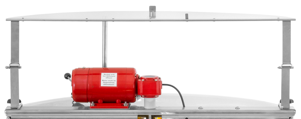 Nahtloser Schrägbodenkessel mit einem zum Quetschhahn vollflächig geneigtem Boden und zwei seitlichen Handgriffen