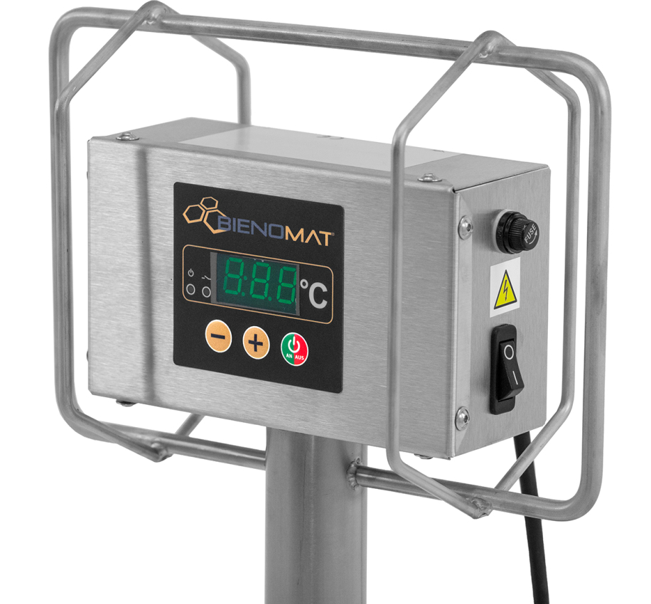 Durch Eigengewicht schmilzt sich der Tauchwärmer durch den kandierten Honig. Programmierbare digitale Steuereinheit. Der Temperaturbereich zwischen 30°C und 55°C wird mit einem Temperatursensor am Fuß gesteuert. 230 V / 1.000 W Ø 33 cm, Gesamthöhe 101 cm Maximale Eintauchtiefe ca. 84 cm Gewicht ca. 4 kg