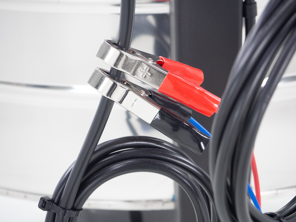 Motor-Unterantrieb 230 V/350 W, mit stufenloser Drehzahlregulierung. Durch mitgelieferte Kabel ist auch ein Betrieb mit einer 12 V Autobatterie möglich